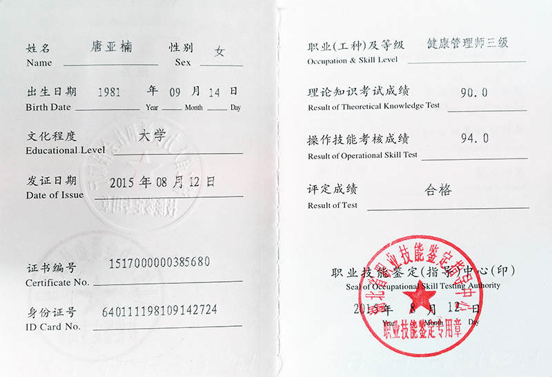 唐亞楠總經理獲得健康管理師資格