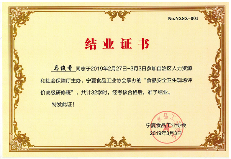 品質(zhì)主管馬俊香參加“食品安全衛(wèi)生現(xiàn)場評價(jià)高級研修班“順利結(jié)業(yè)