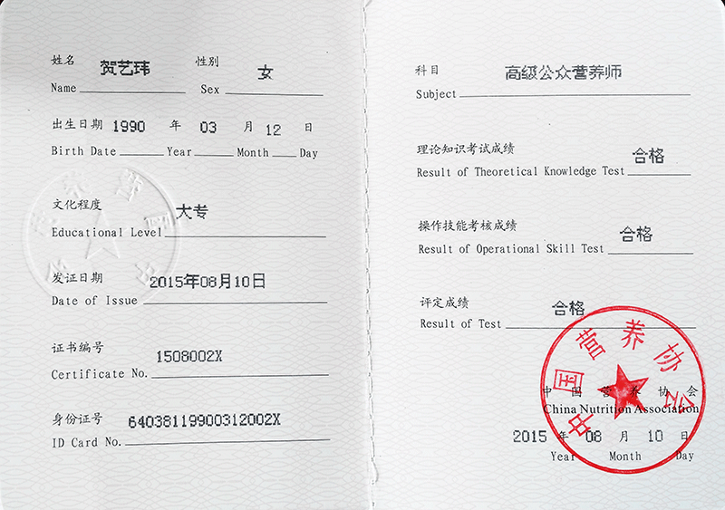 4賀藝瑋獲得高級健康管理師資格